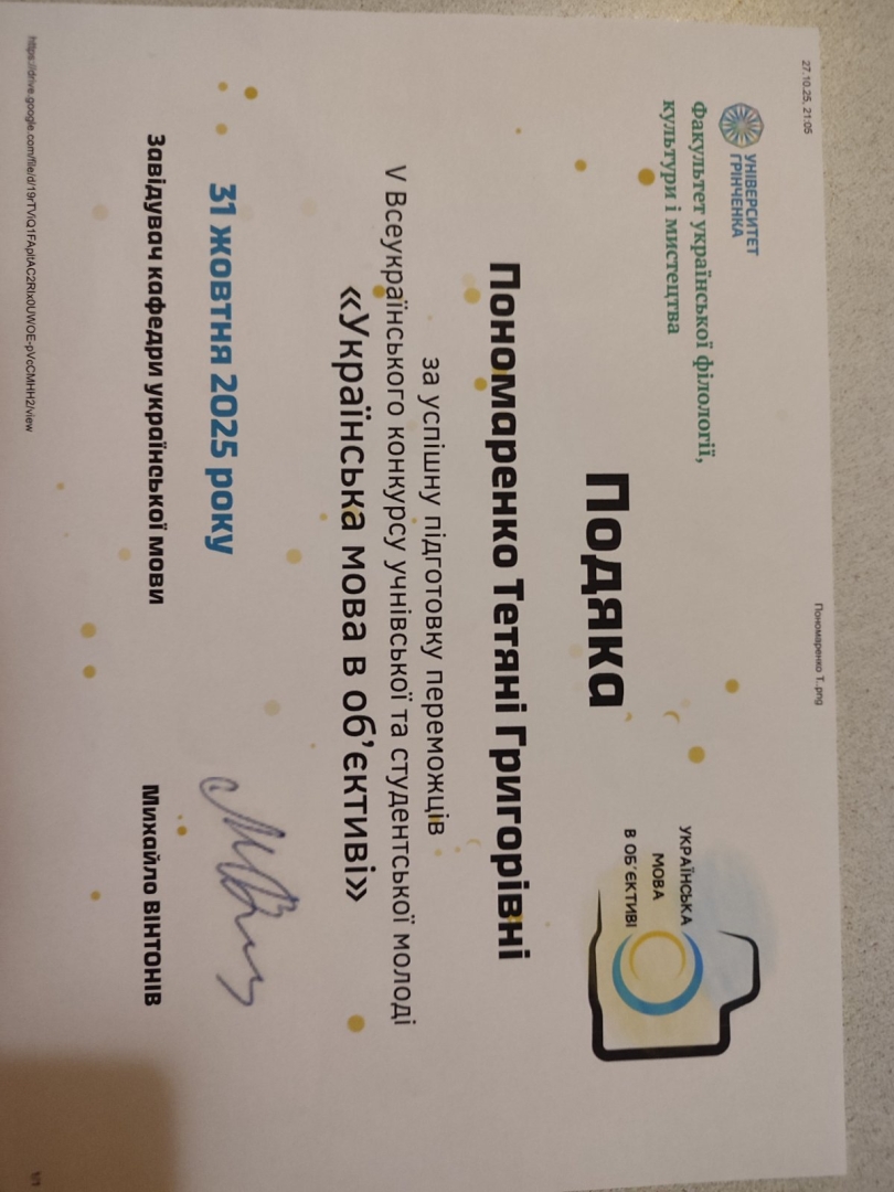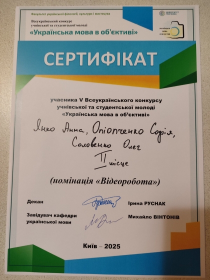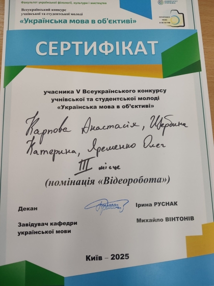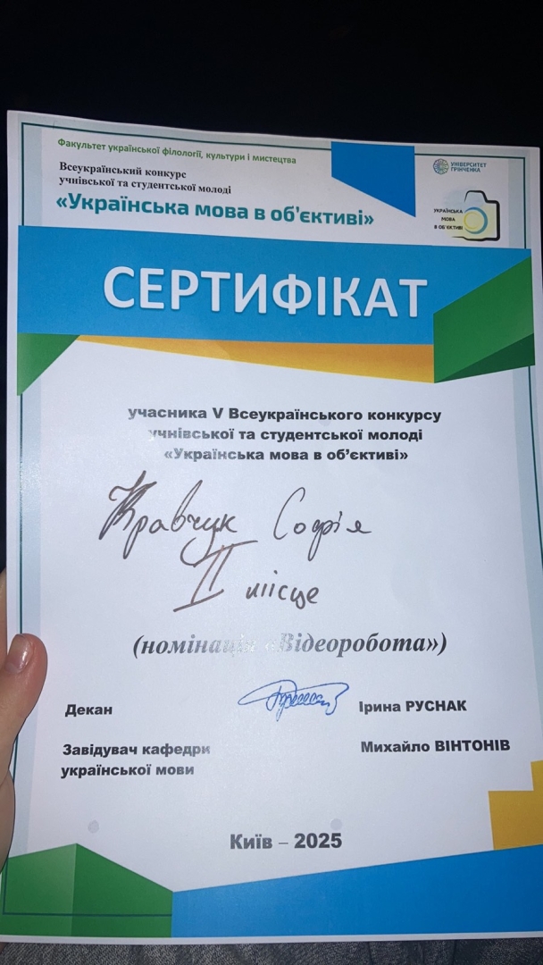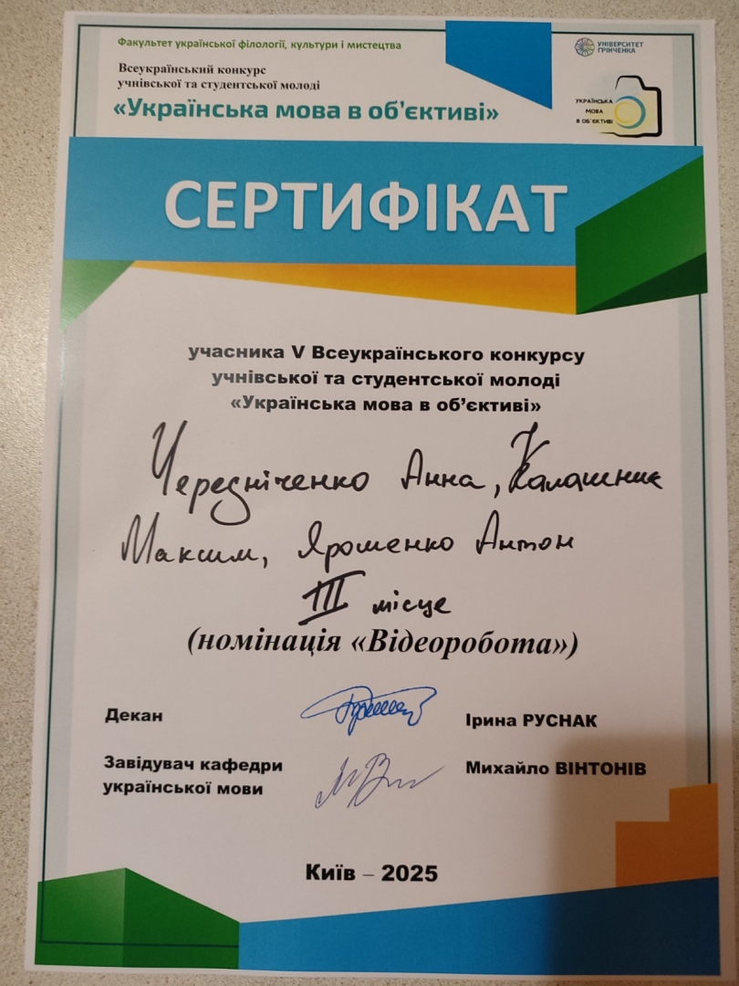 💥💥💥 Пишаємося нашими талановитими креативними учнями 9-В класу- Кравчук Софія посіла почесне - 2-ге місце, Дубчак Дарина, Ткачук Єлизавета - 3-ті місця, 11-Б класу- Янко Анна, Опіопченко Софія, Соловенко Олег- посіли 2-ге місце; Карпова Анастасія, Щербина Катерина, Яременко Олег - 3-тє місце, 11-В класу- Чередніченко Анна, Калашнік Максим, Ярошенко Антон посіли -3-тє місце у 5-му Всеукраїнському конкурсі учнівської та студентської молоді «Українська мова в об’єктиві».